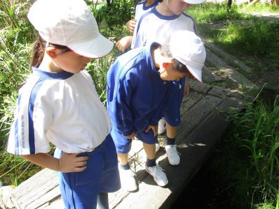生活科の学習では、観察名人になるために、前半はビオトープの植物や生き物に触れました。
