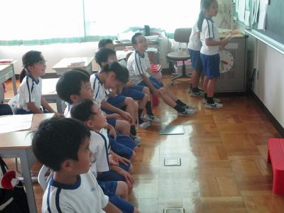 4校時では、読み聞かせ係さんが「もったいないばあさん」を読んでくれました。