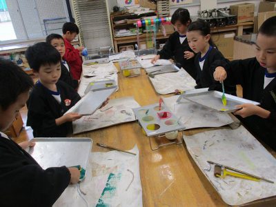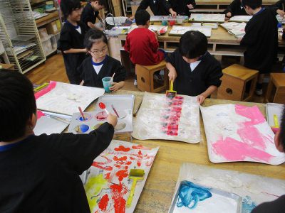 絵の具の色混ぜも、全部を混ぜるのではなく、混ぜないところも残してローラーで塗ると、不思議な色合いになる発見もありました。