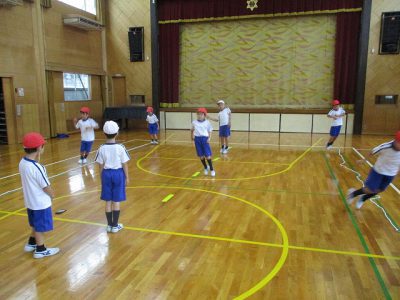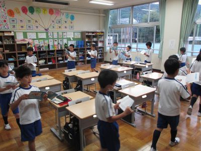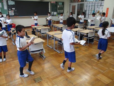 体を動かしながら音読練習。 高く大きな声でスラスラと発声できていました。