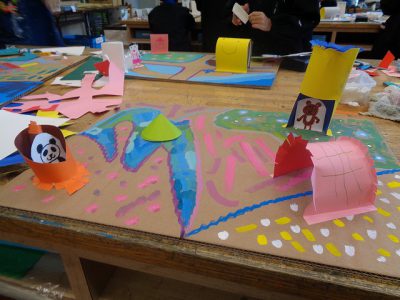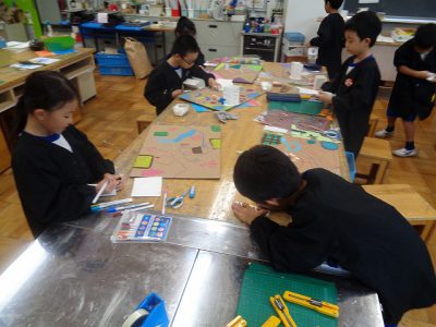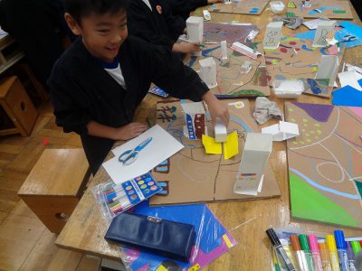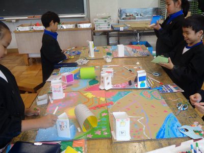 造形室を覗くと、各チームのテーブルには「お寺」や「塔」「○○タワー」と立体作品が並ぶ町並みが広がっていました。
