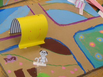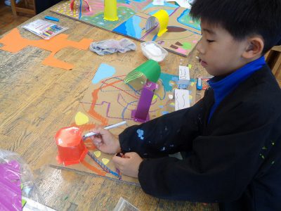 他には、工作用紙を使って、マンションやトンネルなど発想を飛ばし、工夫して作っていました。