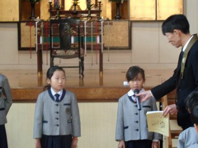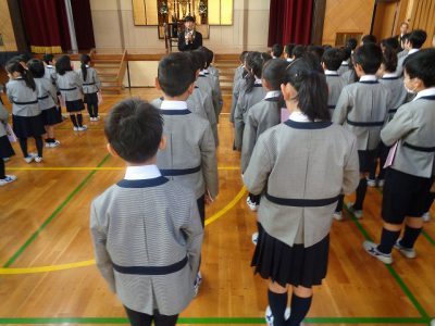 子ども逹は合掌をして、まっすぐ体育館へ移動しています。