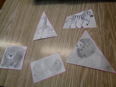 今日は、点と点を直線でつないで動物を囲み、いろいろな三角形や四角形を作っていきました。