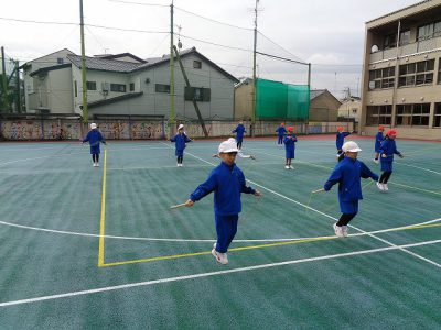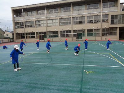 前・後ろ・かけ足・交差とびを行い、体を温めます。