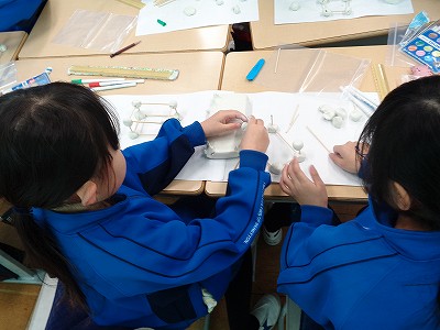 粘土の大きさや竹ひごの長さに注意して、よく考えています。