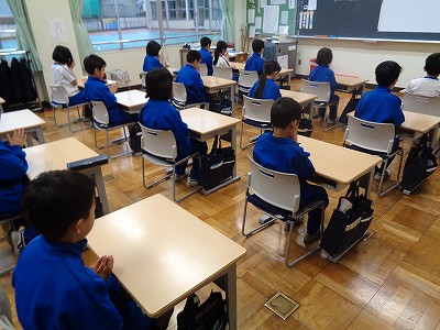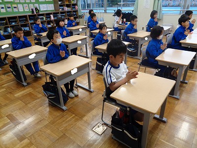 そこで、朝根っこの時間に、全校で黙祷を行い、被災地の復興と被災者の幸せを願いました。