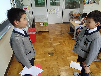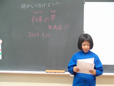 生活科の時間に「明日に向かって進もう」というテーマで一年間をふり返り、将来の夢や目標を発表する会を行いました。