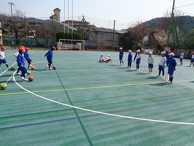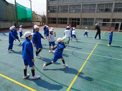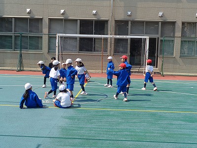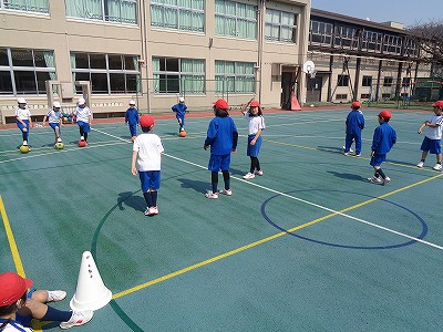 今日の体育は、1・2年生合同の「たまごわりサッカー」です。