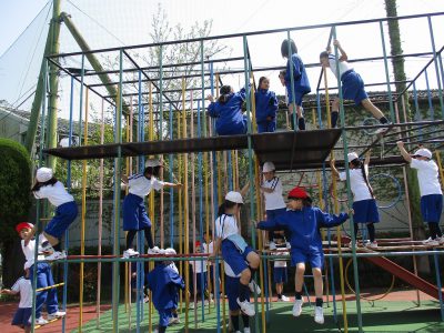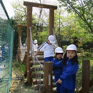 1年生は、先生に「つり橋」の使い方を教えてもらい、のびのびと遊んでいます。