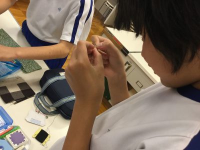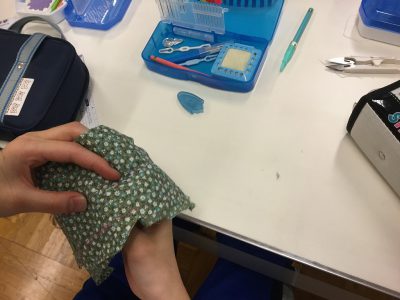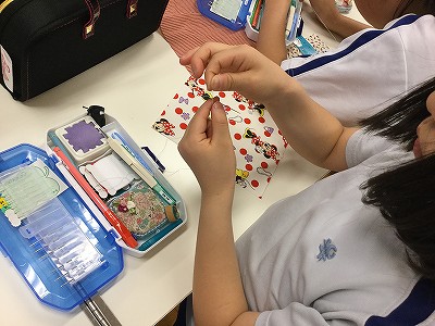 初回は、裁縫セットを持ち寄って、「玉結び」「玉どめ」「なみぬい」の練習です。