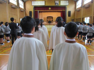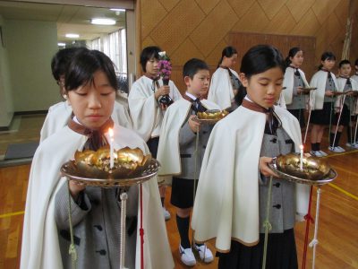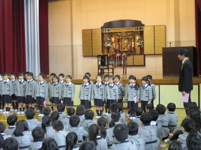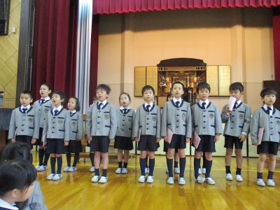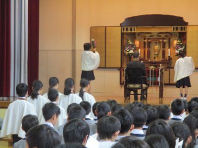 はじめに、5年生の礼拝係6名が、それぞれ歌に合わせて「光」「香」「花」を、阿弥陀様にお供えします。