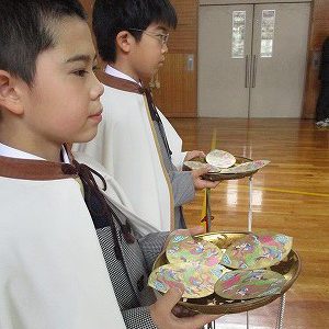 そして、「讃仏」の歌に合わせて、6年生の礼拝係6名が、散華します。