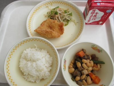 今日の献立は「イカのフライ、ピーマンの炒め物、五目豆」でした。