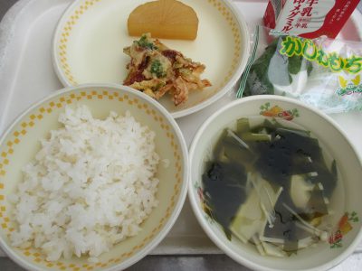 今日の献立は「新玉ねぎのかきあげ、大根の煮物、若竹汁、柏餅」でした。