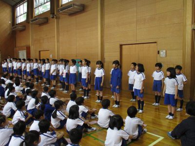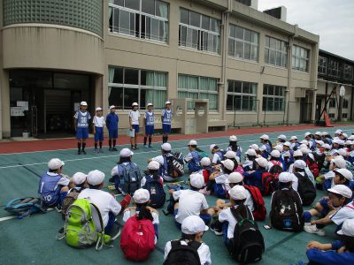 今日のウキウキウォーキングは、雨の予報のため、スタート時刻を早めて、9時前に運動場に集合しました。