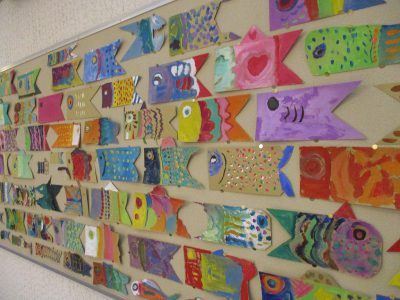 本校の玄関でも、3年生が思い思いにデザインした鯉のぼりが掲示されています。