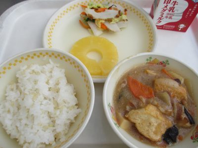 今日の献立は「厚揚げのみそ炒め、塩こんぶあえ、パイナップル」でした。