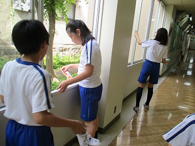 窓枠や靴箱、体育館の窓など普段の掃除の時にできないところをお掃除しました。