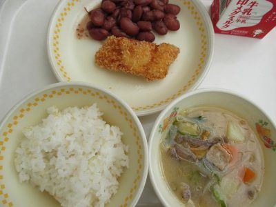 今日の献立は「カレイのフライ、金時豆の甘煮、豚汁」でした。