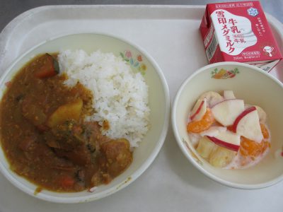 今日の献立は「ポークカレー、フルーツヨーグルト」でした。