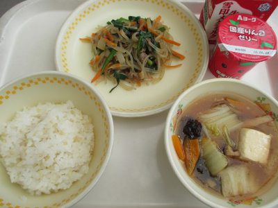 今日の献立は「五目豆腐、チャプチェ、りんごゼリー」でした。