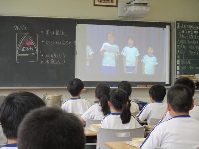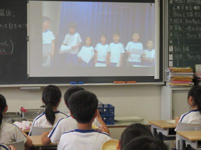 給食の時間に、児童会本部主催の「ナイス切符キャンペーン表彰式」の、