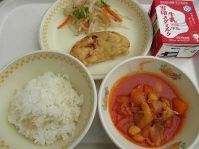 今日の献立は「ポークビーンズ、かぼちゃの天ぷら、ピーマンの炒め物」でした。