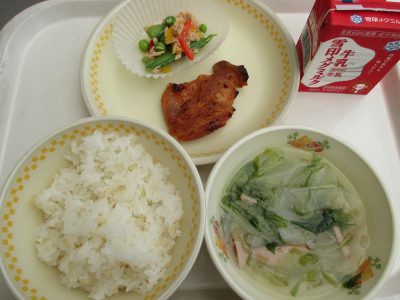 今日の献立は「タンドリーチキン、スナップエンドウのソテー、キャベツのスープ」でした。