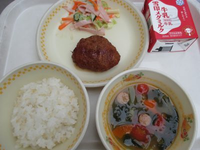 今日の献立は「ハンバーグ、マカロニサラダ、ミニトマトのスープ」でした。
