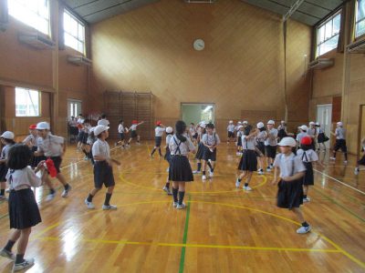 英語のかけ声をたくさん言う、歩き歩きおにごっこです。