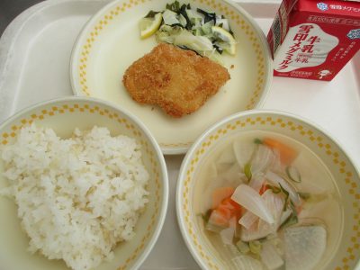 今日の献立は「白身魚のフライ、わかめのサラダ、根菜スープ」でした。