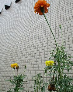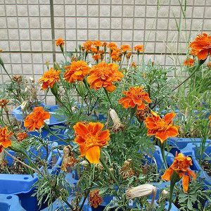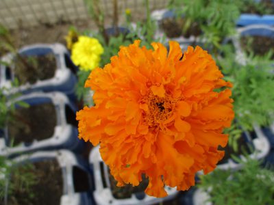 4年生、5年生が一人一鉢栽培をしているマリーゴールドが咲いています。