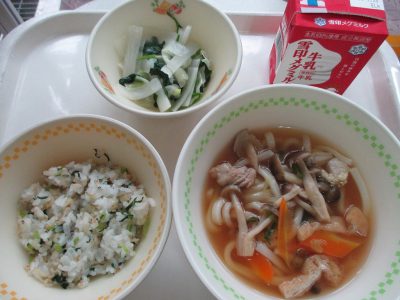 かやくうどんには、油揚げ、鶏肉、ねぎ、人参、しめじを温かい出汁で炊きました。