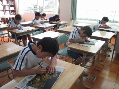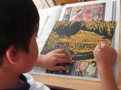 中間休みの学習室では、韓国語講座メンバーが、韓国の風景画「削り絵」を完成させようと取り組んでいました。