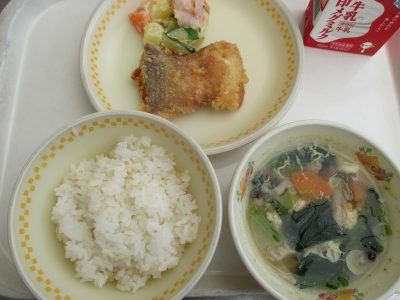 2年生に「すまし汁に使っている出汁は何でしょう」と質問すると、すぐに「かつお出汁!」と答えが返ってきました。味わいながら食べてくれています。