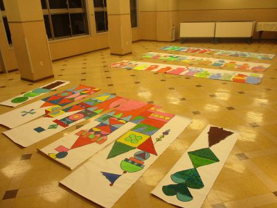 今、発表会で使う1年生と5年生の舞台背景の絵を並べています。