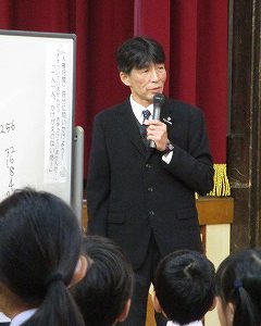 校長先生と一緒に「父母、祖父母、曾祖父母・・・」とご先祖様をさかのぼり、計算していきました。8代前になると256人・・・。もっともっとさかのぼると、びっくりするような数になります。