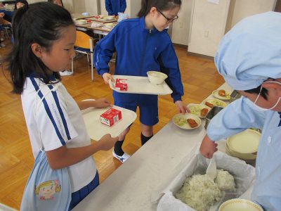 2年生教室では、食事を終えて、6年生班長の発案で学級文庫の読み聞かせが始まりました。