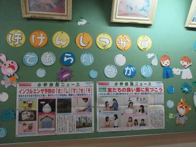 保健室前の掲示を紅葉から、「手洗い うがい」にしました。
