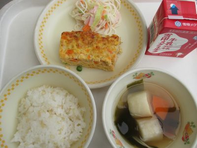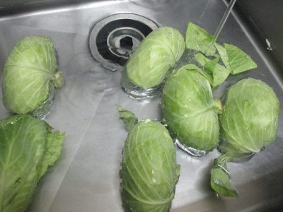 スパゲッティーのサラダには、キャベツ、人参、ハムが入っています。調理員さんがシンクの中に野菜を落として洗っています。
