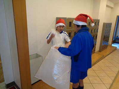 今日は、サンタさん(文教サンタクリーン)に扮装して、校内のゴミ箱のゴミを回収しました。