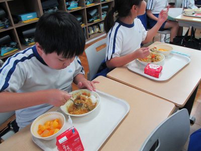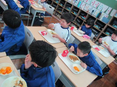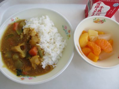 2学期の給食最終日です。今日は冬野菜の「小松菜、大根、ブロッカリー、れんこん、カリフラワー」を使ったカレーライスです。