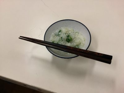あつあつの「七草かぶらがゆ」は、かぶらの優しい香りがただよい、塩加減ばっちりで、大変おいしい仕上がりでした。緑と白の色合いが素敵です。