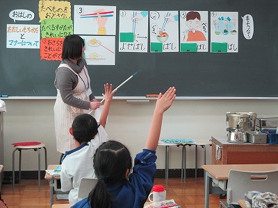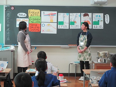 1年生の教室では、給食時間、栄養士の校外実習で来られている京都文教短期大学の実習生さんに、食育指導をしていただきました。テーマは「おはしの正しい持ち方とマナーについて」です。