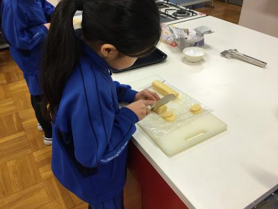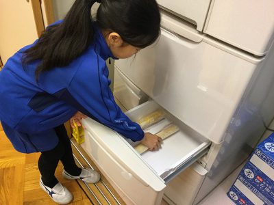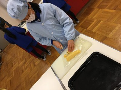 1時間ほどして、6校時のクラブが始まりました。冷凍室から取り出し、輪切りにしているところです。