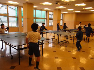 金曜日の朝、7時50分。ミスターヨコヤマが、朝体操の広告を両手に持って、各教室を回ります。英語で宣伝し、教室の他、廊下を歩く一人ひとりにも声をかけます。
