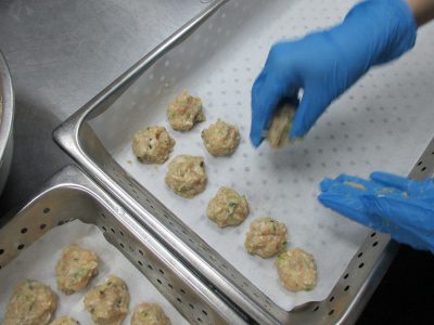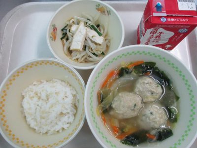 肉団子は、れんこんや葱を混ぜて、調理員さんが一つ一つ丸めてつくりました。