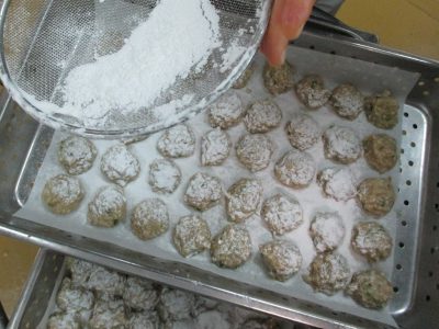 上から片栗粉をふって、形が崩れるのを防ぎます。