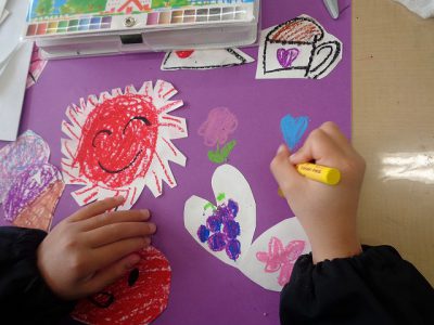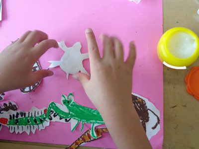 今日は、前回描いた絵を好きな色の色画用紙に貼って作品を仕上げました。